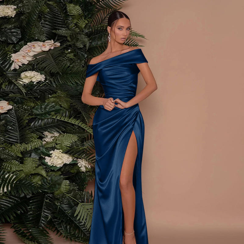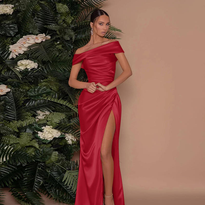 Den asymmetriska skärningen kombineras med en sexig hög slits som ger klänningen både rörelse och attityd. Perfekt för fest, galakvällar, bröllop eller alla tillfällen där du vill känna dig extra strålande.
